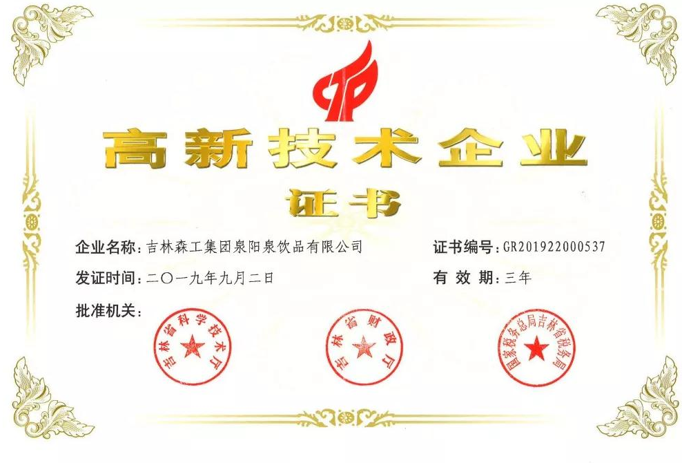 ? ? ? 根據(jù)科學(xué)技術(shù)廳、吉林省財政廳、國家稅務(wù)總局聯(lián)合頒布的《關(guān)于公布吉林省2019年第一批國家高新技術(shù)企業(yè)認(rèn)定結(jié)果的通知》,經(jīng)過層層審核,吉林森工集團(tuán)泉陽泉飲品有限公司由吉林省科學(xué)技術(shù)廳、吉林省財政廳、北京市國家稅務(wù)局、國家稅務(wù)總局吉林省稅務(wù)局局聯(lián)合批準(zhǔn)下發(fā)的高新技術(shù)企業(yè)認(rèn)定。